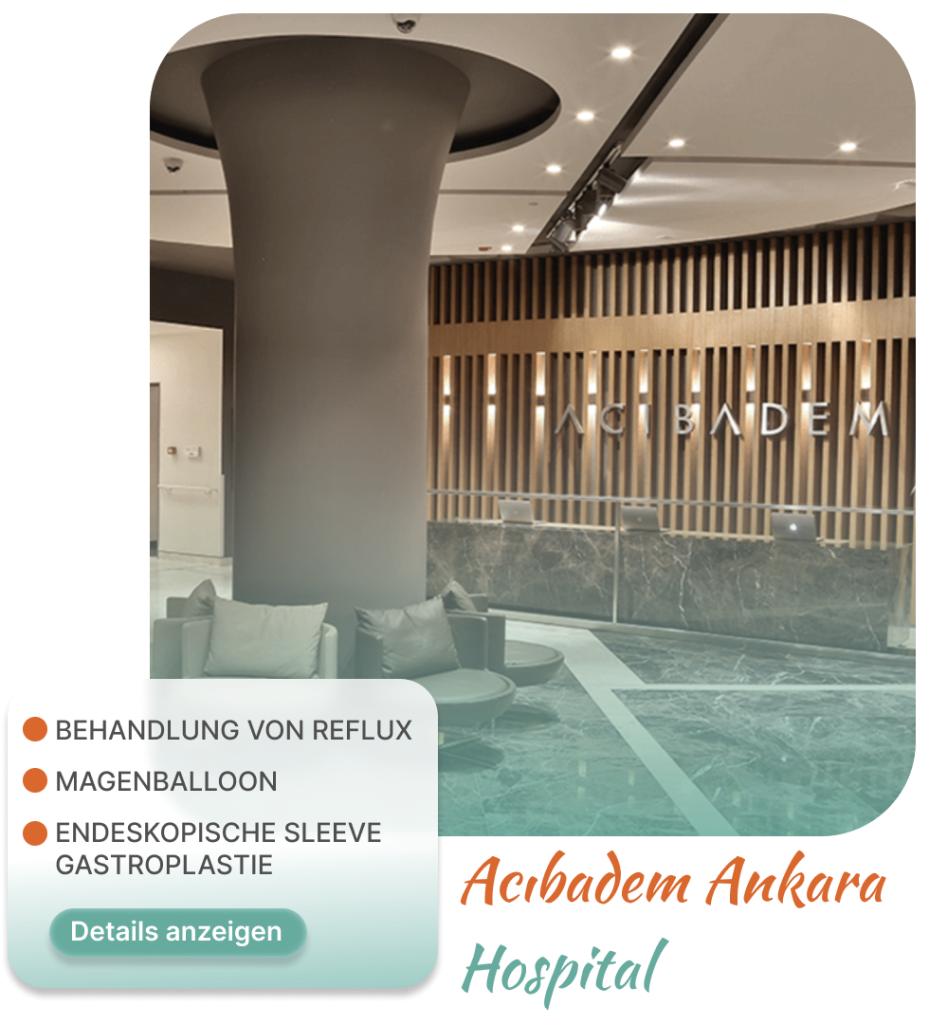 Das Acıbadem Ankara Krankenhaus, das 2012 in Çankaya-Oran von der Acıbadem Mehmet Ali Aydınlar Universität eröffnet wurde, ist mit modernster Medizintechnik ausgestattet und arbeitet mit führenden Experten in verschiedenen medizinischen Bereichen zusammen. Diese Partnerschaft ermöglicht es Dr. Mehmet Çelikbilek, alle drei spezialisierten Dienstleistungen (ESG, Magenballon, und Reflux-Behandlung) an diesem Standort durchzuführen. Insbesondere zwei wichtige Behandlungen – die endoskopische Sleeve-Gastroplastie (ESG) zur Behandlung von Adipositas und fortgeschrittene Reflux-Behandlungen – werden ausschließlich hier angeboten und garantieren höchste Behandlungsstandards.